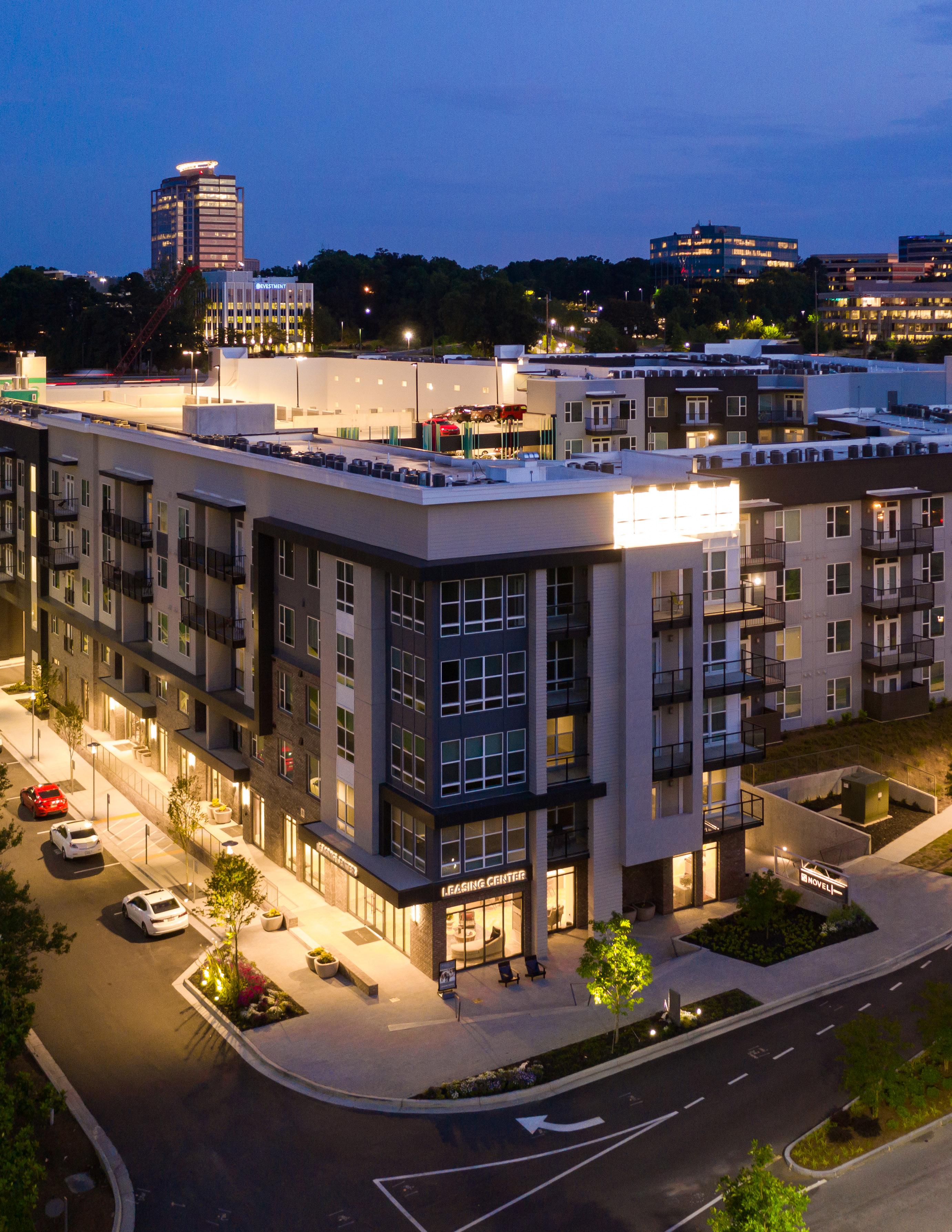 The Park and Market development fuels the community in North Raleigh. It features studio, loft, one-, and two-bedroom apartments with exciting and convenient amenities. This mixed-use complex is located directly above a Harris Teeter and other shops, offering around 100,000 SF of retail. Amenities include a pool, outdoor fire pits, grilling stations, a pet park, clubhouse, and work spaces.