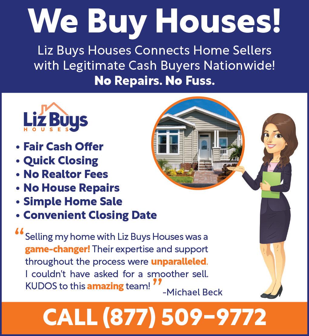 We Buy Houses for Cash AS IS! No repairs. No fuss. Any condition. Easy three step process: Call, get cash offer and get paid. Get your fair cash offer today by calling Liz Buys Houses: 1-877-509-9772. (MB)