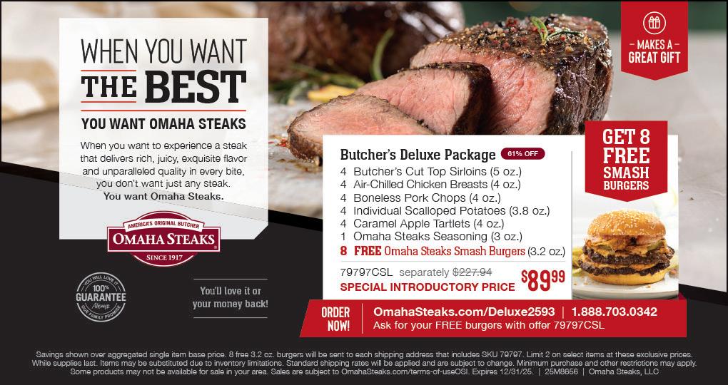 When you want the best, you want Omaha Steaks! 100% guaranteed and delivered to your door! Our All-Time Grill Faves comes with 8 FREE Omaha Steaks Burgers ONLY $99.99. Mention code 76946ENT when you visit OmahaSteaks.com/OneBite2263 or call 1-888-703-0342 today. (MB)