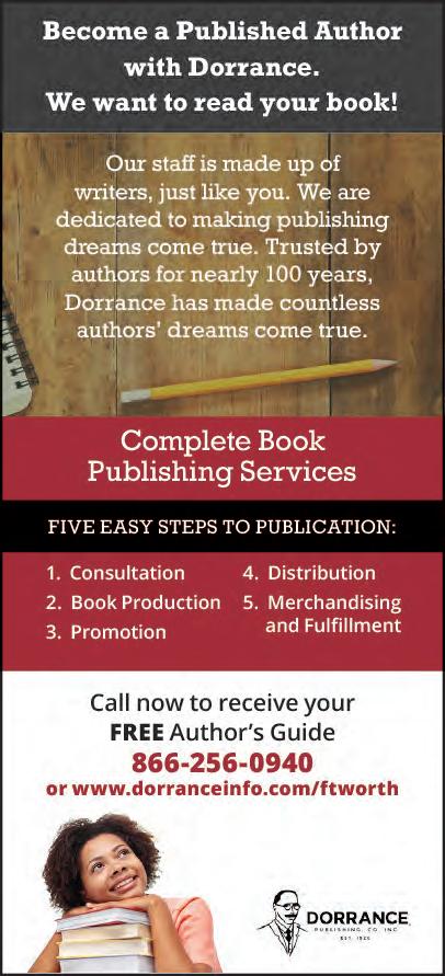 Dorrance Publishing, trusted by authors since 1920, is accepting submissions. Book manuscripts are currently being reviewed. Comprehensive services include consultation, production, promotion and distribution. Call 1-866-256-0940 or go to DorranceInfo.com/ftworth for your free author`s guide and become a published author. (MB)