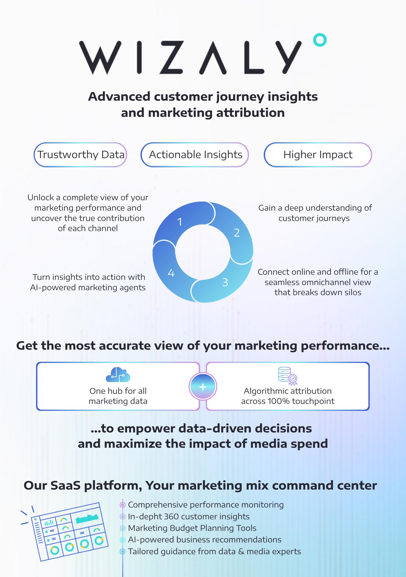 Wizaly is an advanced, cross-device SaaS marketing attribution platform, powered by AI, that helps businesses optimize their digital marketing ROI by providing a data-driven view of performance across channels, including both online and offline conversions. Wizaly’s analysis incorporates both tracked user-centric journeys and statistical touchpoints, such as social network and offline media to provide the most accurate ROI measurement using a combination of algorithmic and MMM analysis. Wizaly also provides actionable insights into customer behavior and improved decision-making by incorporating such parameters as customer segments and product segments in its analysis. Advanced Marketing Insights for Every Customer Journey