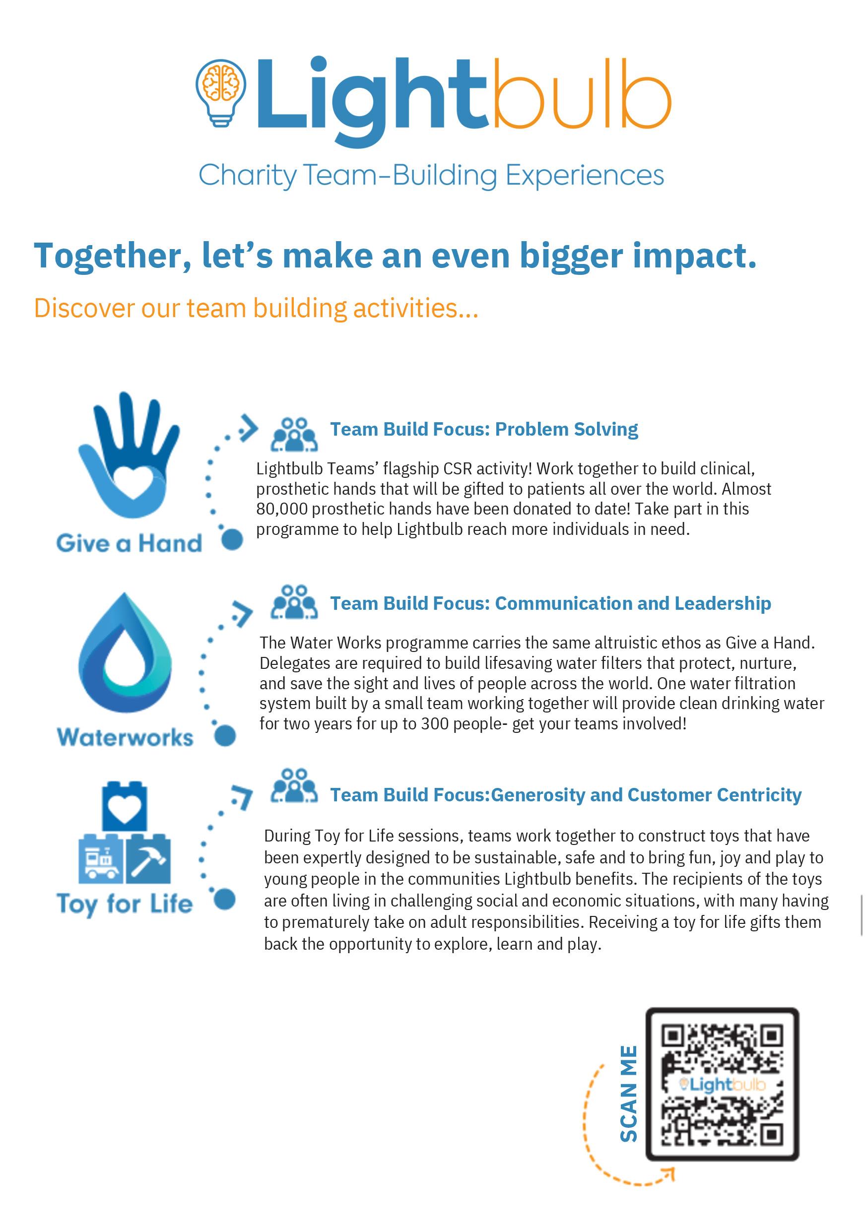 We create meaningful change in the world through delivering impactful Team Building experiences.We offer more than your typical team-building company. We deliver immersive and interactive experiences that go beyond traditional norms. We offer multiple CSR-focused sessions that allow your teams to come together, empowering them to step into their potential and serving as an opportunity for your organisation to make a positive impact to people in need, across the world. Our reach is global, we work with some of the world’s biggest brands and we deliver event internationally. Trusted by some of the world’s biggest brands, we believe that meaningful change can be ignited by handson activities that engage both hearts and minds. Our focus is on making a real difference, from assembling hands, to providing life-saving water filters, and building toys for life,