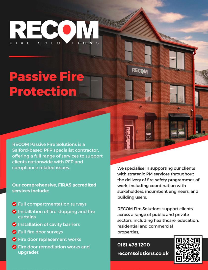 RECOM Fire Solutions are a Salford based SME, specialising in Passive Fire Protection, offering a full range of services to support both public and private sector clients with compliance related works. We are a FIRAS approved contractor with a team of skilled and experienced supervisors and technicians ready to install the best fire protection product or solutions. Our team installs and maintains PFP measures throughout live environments, supporting large NHS trusts, multischool Academy Trusts, and world recognised commercial organisations. We utilise a fire-industry specific software to develop and maintain a Golden Thread of information, helping our clients to achieve compliance with the RRFSO 2005 and more recent legislative updates, including the Building Safety Act.