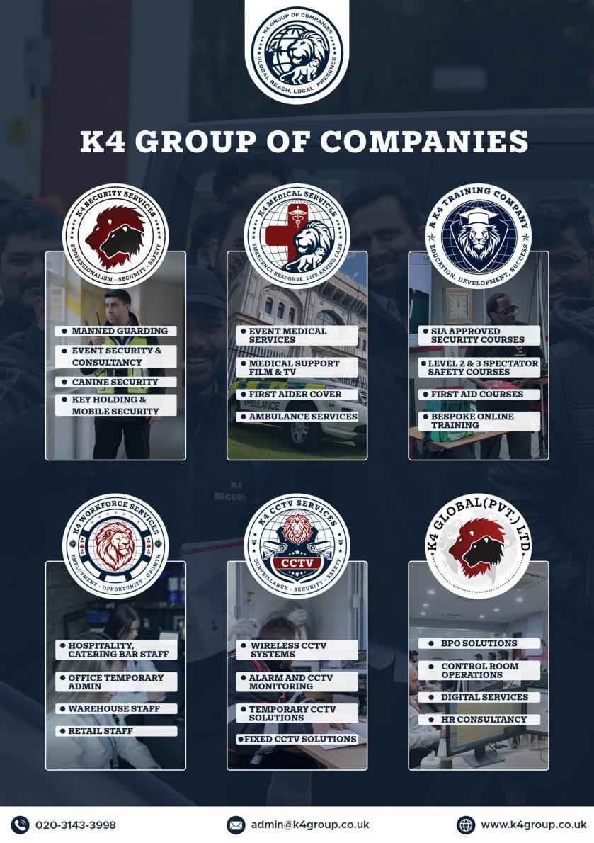 K4 Group Services operates with a strong commitment to excellence. We offer a diverse range of services tailored to meet the unique needs of our clients under one roof. Whether you require security services, event consultancy, medical services, CCTV-solutions, workforce support, training programs, or global digital services, K4 Group Services is here to provide top-quality, reliable solutions. Our vision is to offer a wide range of services within a single, trusted partnership, we simplify the process for our clients, ensuring that they receive consistent, high-quality service every time. Whether it’s safeguarding your property, managing large-scale events, providing critical medical support, or training the next generation of professionals, K4 Group is your all-inclusive solution, ensuring peace of mind and operational efficiency across all areas of your business. Together, we build safer, stronger, and more resilient communities, empowering our clients to focus on their core objectives while we handle the rest.