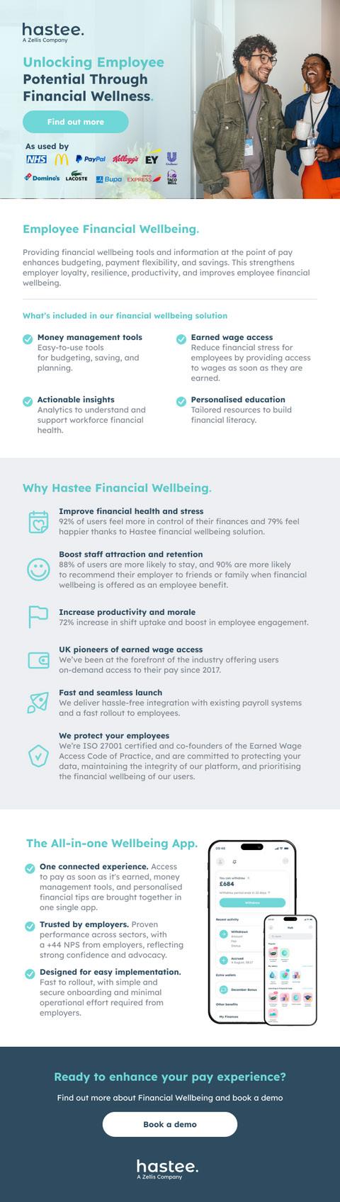 Part of the Zellis Group, Hastee provides payroll integrated financial wellbeing, earned wage access, AI coaching, state benefits eligibility, financial education, retail discounts, payroll savings and credit building tools through the lens of ‘earn, learn, grow’. We help your workforce on their personal financial journeys, reducing stress, improving productivity, employee engagement and loyalty to reduce hiring costs whilst enabling you to position yourself as an employer of choice. Our flexible deployment and configuration means we will fit into your existing tech and HR ecosystem seamlessly. You can choose your preferred method of integration and the portals to access our services that best fit, e.g. browser, native app, webview, API to your own UX, all branded to match your tone and message.