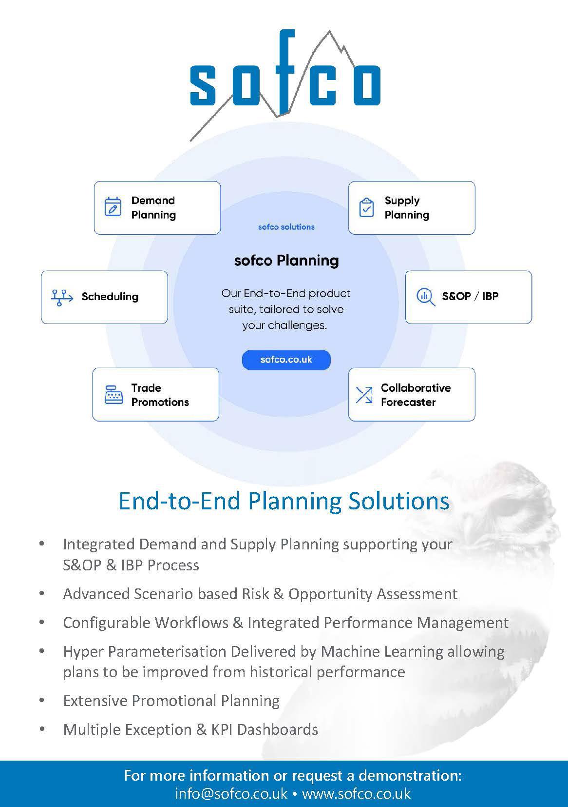 sofco is a leading provider of integrated and collaborative End-to-End Planning Solutions for the Consumer Goods, Manufacturing & Retail sectors. The applications cover planning, intelligence and execution, and support strategic business processes including Sales & Operations Planning, Trade Promotion Management, Supply Planning, Production Planning and Scheduling. sofco serves leading global organisations including Greencore, Signet Jewelers, Young’s Seafood, Liz Earle, and many more household brands, providing an End-to-End Planning and Supply Chain Visibility solution which fully supports ‘Operational Analytics’ including ‘What If’ scenario-based planning and supply chain financial view. Whether on site or in the Cloud, our customers have seen significant benefits from reduction in inventory, reduction in stock-outs for fastmoving goods, increased product availability and a reduction in working capital.