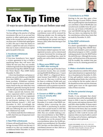 10 ways to save clients taxes if you act before year-end 1. Consider tax-loss selling Tax-loss selling is the practice of selling investments that are in an accrued loss position to offset capital gains realized either in the current year or in the previous three years. If clients had capital gains in 2022, this year is their last chance to realize a capital loss and carry it back to that year to claim a refund of any capital gains tax paid in that year. 2. Accelerate withdrawals under the HBP If first-time homebuyers have signed a written agreement to buy or build a qualifying home they will move into within the next year, they can consider withdrawing funds from their Registered Retirement Savings Plan (RRSP) through the Home Buyers’ Plan (HBP) before December 31, 2025. A first-time homebuyer and spouse or partner can each withdraw up to $60,000 from their RRSPs for a qualifying first home purchase. Withdrawn amounts must be repaid in future annual instalments, based on the year when they were withdrawn, generally starting the second year after the year of the first withdrawal. Under a special rule, however, temporary repayment relief is available to defer the start of the 15-year repayment period by an additional three years for participants making a first withdrawal between January 1, 2022 and December 31, 2025. Accordingly, the 15-year repayment period would start the fifth year following the year in which a first withdrawal was made. So, if clients made their first withdrawal in 2025, their first year of repayment won’t be until 2030! 3. Take TFSA withdrawals If clients will need funds from a Tax-Free Savings Account (TFSA) over the next 12 months or so, they can consider making a withdrawal before December 31, 2025, 24 FORUM NOVEMBER 2025