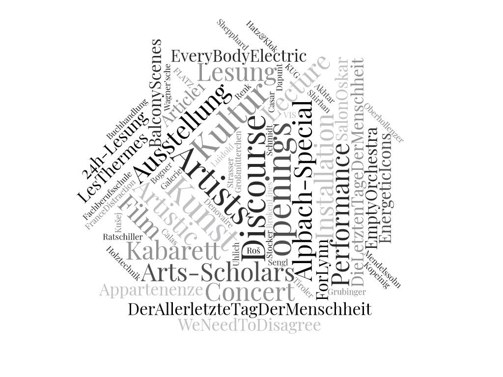 In cooperation with RADA – Royal Academy of Dramatic Art London; Bath Spa University; KUG – University of Music and Performing Arts Graz; TU Wien; TFBS –Tyrolean Fachberufsschule of Wood Technology; Wagner’sche Universitätsbuchhandlung Innsbruck; Studio Calas; VIS Vienna Shorts Festival
