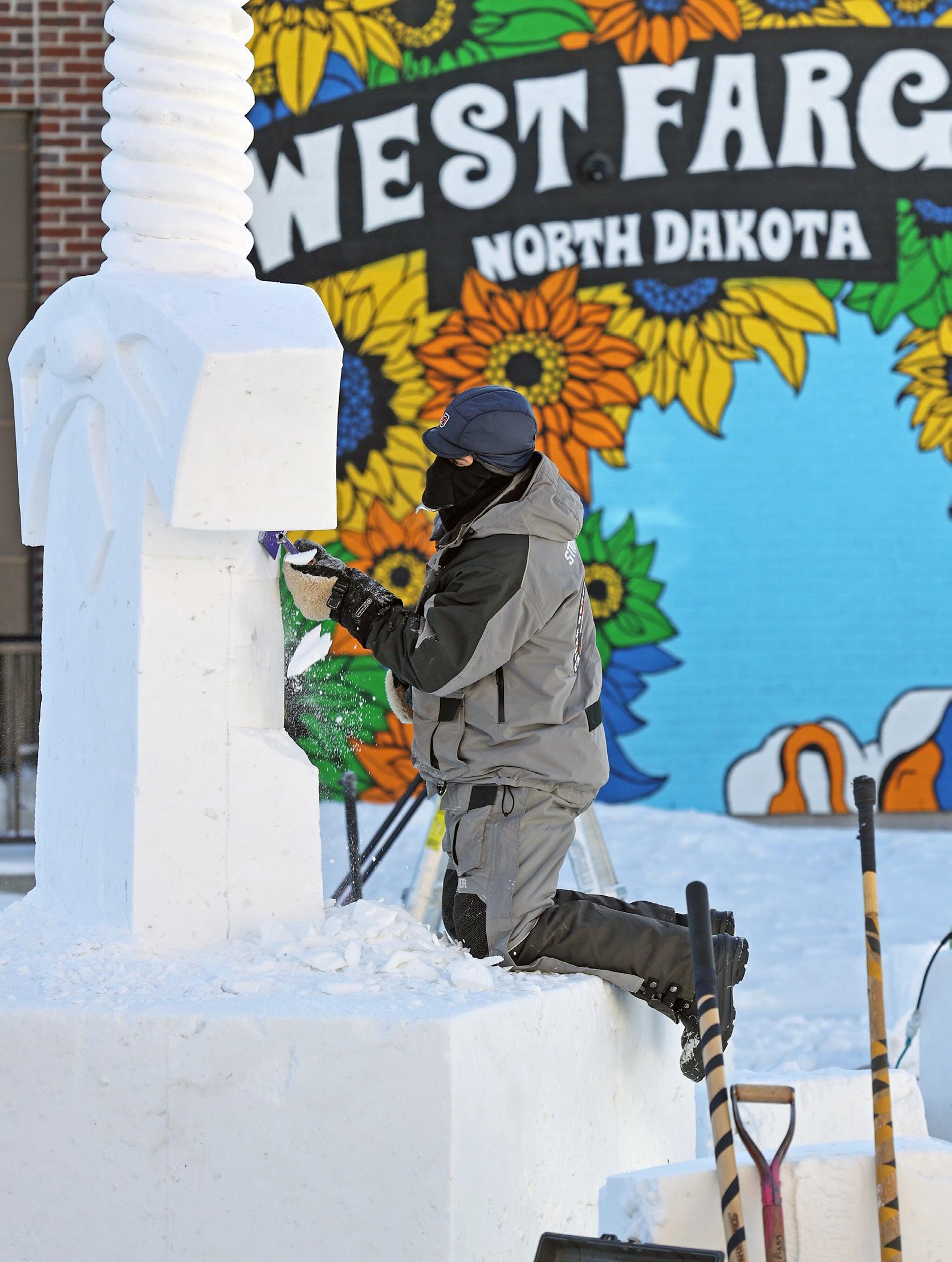 Team North Dakota Snow Sculpture member Josh Zies chisels away on a sword on Thursday, Jan. 23, 2025, at the POW/MIA Plaza along Sheyenne Street in West Fargo.