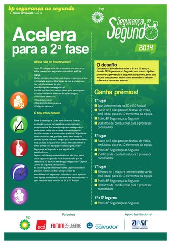 Ganha prémios! 1º lugar ■ Spot vídeo emitido na SIC e SIC Radical ■ Passe de 3 dias para um festival de verão, em Lisboa, para os 10 elementos da equipa ■ Troféu BP Segurança ao Segundo ■ 300 litros de combustível para o professor coordenador