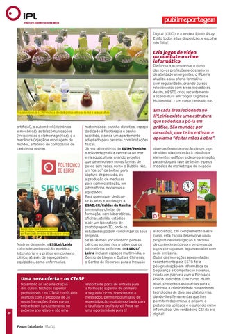 Cria jogos de vídeo ou combate o crime informático De forma a acompanhar o ritmo das novas profissões e dos setores de atividade emergentes, o IPLeiria atualiza a sua oferta formativa com regularidade, criando cursos relacionados com áreas inovadoras. Assim, a ESTG criou recentemente a licenciatura em “Jogos Digitais e Multimédia” – um curso centrado nas Nos laboratórios da ESTM/Peniche, a atividade prática centra-se no mar e na aquacultura