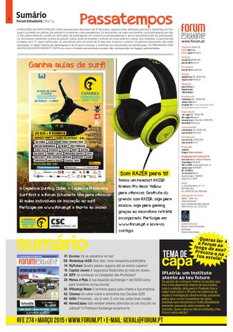 Escolas Vê se passámos na tua! Workshop IADE Dois dias. Uma campanha publicitária MyFuture Quatro passos seguros até ao ensino superior Capital Jovem A Segurança Rodoviária já roda em Aveiro IEFP Já conheces os Campeões das Profissões? Menos é Mais A tua equação da Energia = até 5000 euros para investires na tua escola! IPStartup Week O primeiro passo para criares a tua empresa Cinema Um olhar sobre a cerimónia dos Óscares 2015 SóRir Primavera... ela aí vem. E com ela, umas boas risadas HorosCópos Vais receber olhares atrevidos ou um biscoito na cabeça? O Professor Esótanga esclarece-te