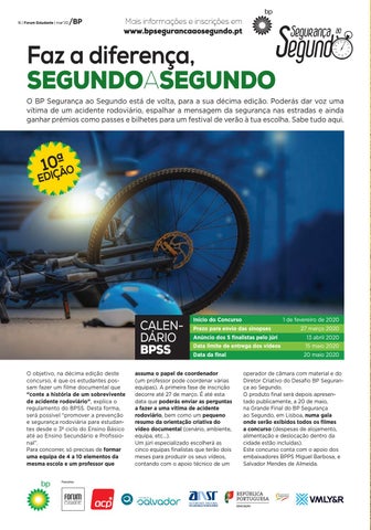 CALENDÁRIO BPSS O objetivo, na décima edição deste concurso, é que os estudantes possam fazer um filme documental que “conte a história de um sobrevivente de acidente rodoviário”, explica o regulamento do BPSS. Desta forma, será possível “promover a prevenção e segurança rodoviária para estudantes desde o 3º ciclo do Ensino Básico até ao Ensino Secundário e Profissional”. Para concorrer, só precisas de formar uma equipa de 4 a 10 elementos da mesma escola e um professor que