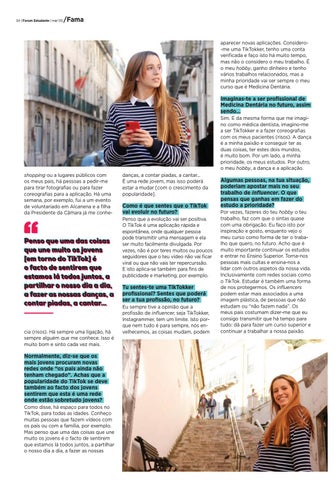 Imaginas-te a ser profissional de Medicina Dentária no futuro, assim sendo... Sim. E da mesma forma que me imagino como médica dentista, imagino-me a ser TikTokker e a fazer coreografias com os meus pacientes (risos). A dança é a minha paixão e conseguir ter as duas coisas, ter estes dois mundos, é muito bom. Por um lado, a minha prioridade, os meus estudos. Por outro, o meu hobby, a dança e a aplicação. shopping ou a lugares públicos com os meus pais, há pessoas a pedir-me para tirar fotografias ou para fazer coreografias para a aplicação. Há uma semana, por exemplo, fui a um evento de voluntariado em Alcanena e a filha da Presidente da Câmara já me conhe-