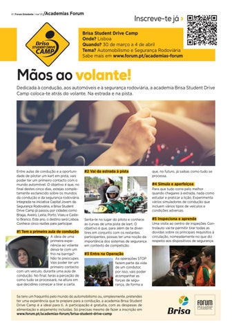 Se tens um fraquinho pelo mundo do automobilismo ou, simplesmente, pretendes ter uma experiência que te prepare para a condução, a academia Brisa Student Drive Camp é a ideal para ti. A participação é gratuita, com as despesas de alimentação e alojamento incluídas. Só precisas mesmo de fazer a inscrição em www.forum.pt/academias-forum/brisa-student-drive-camp