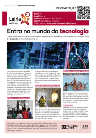 #4 Diverte-te Durante esta semana, terás a oportunidade de conhecer o funcionamento de empresas que utilizam tecnologia de ponta. Vais poder acompanhar todo o processo de criação dos produtos e até ser empresário por um dia. A Leiria-In é organizado pela Forum Estudante e pelo Instituto Politécnico de Leiria. Caso queiras fazer esta ligação direta à tecnologia, basta preencheres o formulário em www.forum.pt/academias-forum/leiria-in. Os custos ficam por nossa conta, por isso, não tens de te preocupar com despesas. Só precisas mesmo de te inscrever.