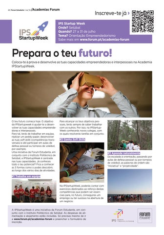 #1 Trabalha em equipa Na IPStartupWeek, poderás contar com exercícios destinados ao reforço destas competências que podem ser essenciais para, no futuro, conseguires um emprego ou ter sucesso na abertura de um negócio. A IPStartupWeek é uma iniciativa da Forum Estudante, em conjunto com o Instituto Politécnico de Setúbal. As despesas de alimentação e alojamento estão incluídas. Só precisas mesmo de ir a www.forum.pt/academias-forum e preencher o formulário de inscrição.