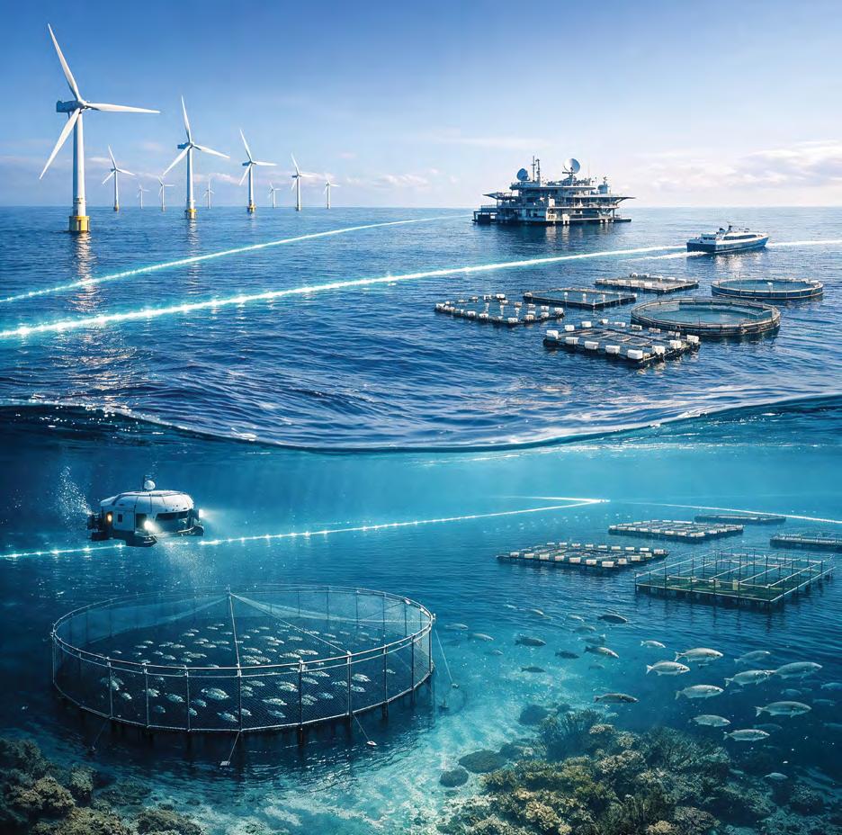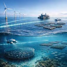 oceanos: mudanças demográficas, o clima e o ambiente, a geopolítica, a transformação do sistema energético e as tecnologias e digitalização. As conclusões apresentadas mostram que o setor continuará a crescer, mas a um ritmo mais lento que em décadas anteriores, prevendo vários cenários ligados à velocidade de transição mais para políticas sustentáveis. Nos próximos anos espera-se a continuidade de uma política de transição energética, com a expansão da capacidade da energia éolica offshore até 2030 (atualmente de 83 gigawatts, de acordo com o Conselho Global de Energia Eólica), o crescimento da aquacultura (embora a um ritmo mais lento que nas últimas décadas) e o fortalecimento de acordos para a conservação marítima e sustentabilidade dos oceanos.