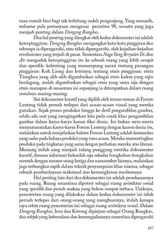 tuan rumah bisu bagi tak terhitung sudah pengunjung. Yang menarik, terlontar pula pertanyaan mengenai peristiwa 98, sesuatu yang juga menjadi penting dalam Dongeng Rangkas. Dua hal penting yang diangkat oleh kedua dokumenter ini adalah keterpinggiran. Dongeng Rangkas mengangkat kota-kota pinggiran dan seberapa ia dipengaruhi, atau tidak dipengaruhi, oleh kejadian-kejadian revolusioner yang terjadi di pusat. Sementara Naga Yang Berjalan Di Atas Air mengaduk keterpinggiran itu ke sebuah ruang yang lebih sempit dan spesifik: kelenteng yang menampung narasi tentang pasangan pinggiran: Koh Liong dan Istrinya; tentang etnis pinggiran: etnis Tionghoa yang alih-alih digambarkan sebagai etnis kalem yang rajin berdagang, malah digambarkan sebagai etnis yang sama saja dengan etnis manapun di nusantara ini sepanjang ia ditempatkan dalam ruang sosialnya masing-masing. Sisi dokumenter kreatif yang dipilih oleh teman-teman di Forum Lenteng tidak pernah terlepas dari acuan-acuan visual yang mereka gunakan. Sejak proses produksi hingga ke detil pengambilan gambar, selalu ada saat yang mengingatkan kita pada corak khas pengambilan gambar dalam karya-karya kanon fiksi dunia. Ini bukan serta-merta menyamaratakan karya-karya Forum Lenteng dengan kanon dunia itu, melainkan untuk menjelaskan bahwa Forum Lenteng adalah komunitas yang sadar pada bahaya produksi yang tuna acuan. Mereka mementingkan produksi pada tingkatan yang sama dengan perhatian mereka atas literasi. Memang inilah yang menjadi tulang punggung estetika dokumenter kreatif, dimana informasi bukanlah saja sekedar bongkahan-bongkahan mentah dengan narator orang ketiga dan narasumber lainnya, melainkan juga terbungkus rapih dalam teknik penyampaian khas sinema, sebagai sebuah pemberdayaan maksimal atas kemungkinan mediumnya. Hal penting lain dari dua dokumenter ini adalah penekanannya pada ruang. Ruang senantiasa dipotret sebagai ruang arsitektur sosial yang spesifik dan penuh makna yang belum sempat terbaca. Uniknya, pemotretan ruang yang dilakukan dalam kedua dokumenter ini tidak pernah terlepas dari orang-orang yang menghuninya, itulah kenapa saya sebut ruang pemotretan ini sebagai ruang arsitektur sosial. Dalam Dongeng Rangkas, Iron dan Kiwong dipinjam sebagai Orang Rangkas, dua subjek yang keberadaan dan kemengadaannya senantiasa dipengaruhi 187
