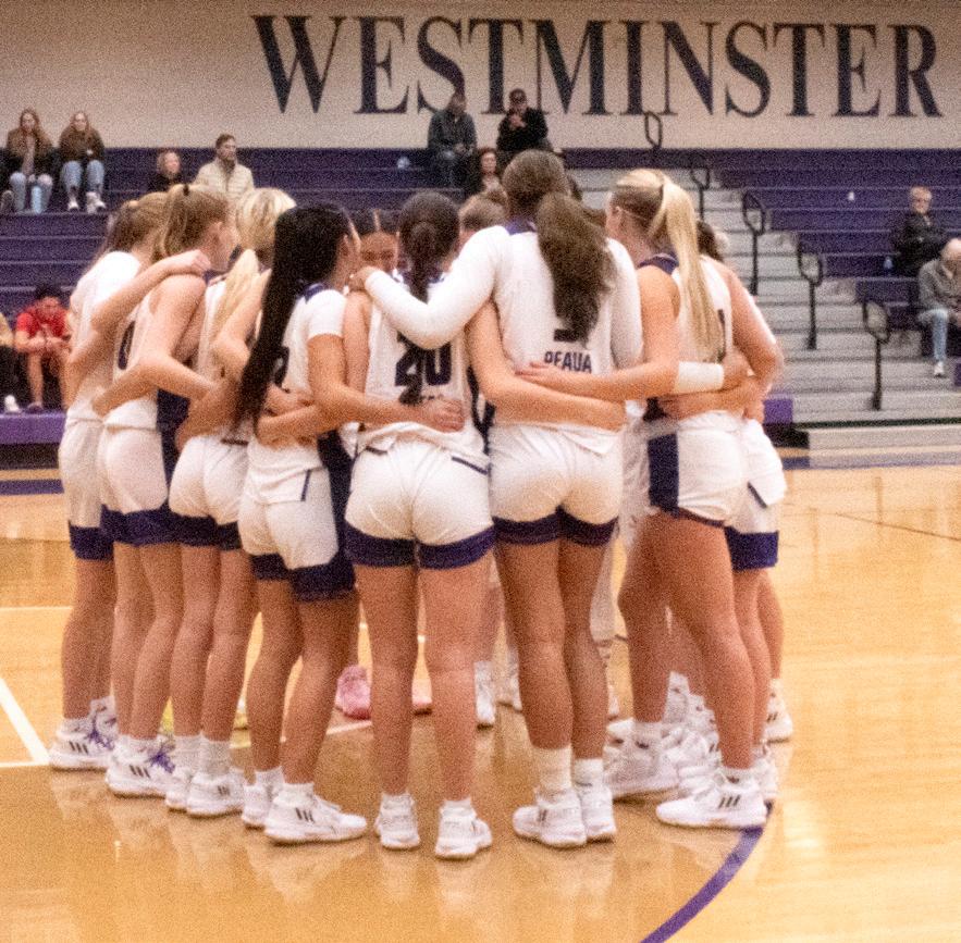 The Westminster College women’s basketball team huddles up prior to their game against the University of Arkansas Fort Smithin Payne Gymnasium Nov. 11. "The whole team is super close on and off the court which makes it always something to look forward to each day whether it be lift, practice or a game," said Mailey Ballard, a sophomore sports management major.