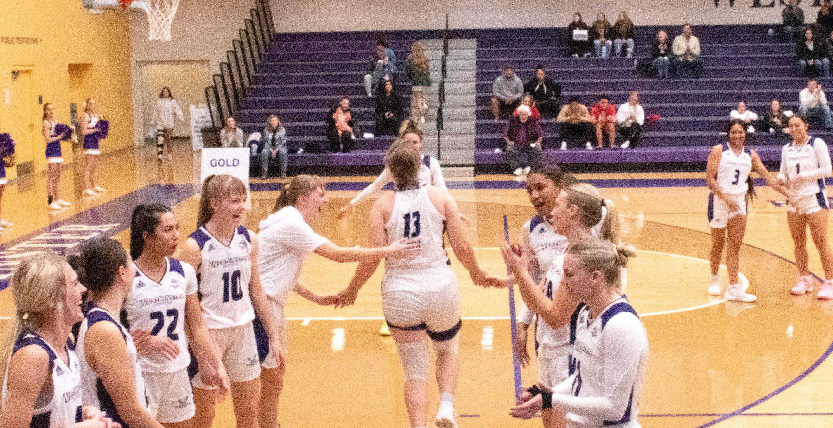 The Westminster College women's basketball team cheers for the starting players before the game against the University of Arkansas Fort Smith in Payne Gymnasium Nov. 11. "There is a ton of team building we try to do as far as getting a more connected, comfortable team," said Jenteal Jackson, the women's basketball head coach.