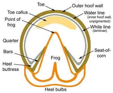 “It is often assumed that the frog contacts the ground immediately, pressing upward against the digital cushion (so-called frog pressure). It is more reasonable, and in fact the case, that the middle phalanx presses the cushion down upon the frog, and that the frog touches the ground secondarily, if at all. The frog, normally soft, is poorly adapted for taking the immediate shock of the impact.