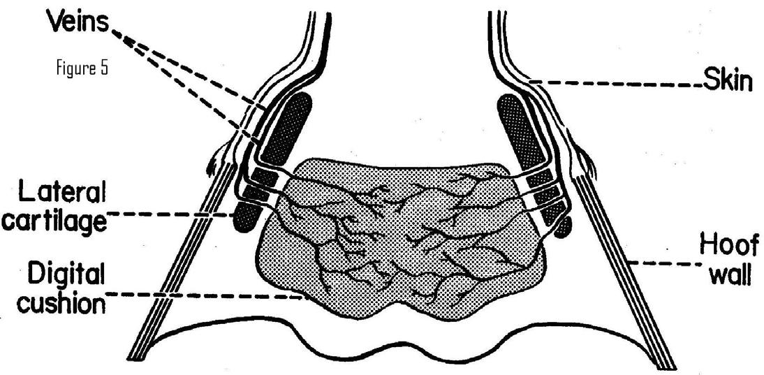 “The pressure developed in the digital cushion, however, is surely great enough to shut down the thin-walled veins, stopping the blood flow. By having the veins pass through the stiff cartilage, the venous shunts from the cushion to the plexus between the cartilage and the hoof capsule would be protected from such a shutdown. (Figure 5)