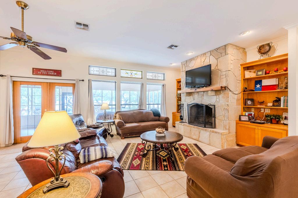 The headquarters includes a single-story ranchstyle home built in 2000 The house features three bedrooms, two bathrooms, and approximately 2,258 sq ft of living space Inside, an open living and dining area with 10-foot ceilings is anchored by a wood-burning rock fireplace. The kitchen includes an island with a dining/breakfast bar, offering both function and space for gathering. Just off the main living area, a 431 sq ft screened-in porch provides a quiet spot to enjoy the outdoors and overlooks a landscaped patio