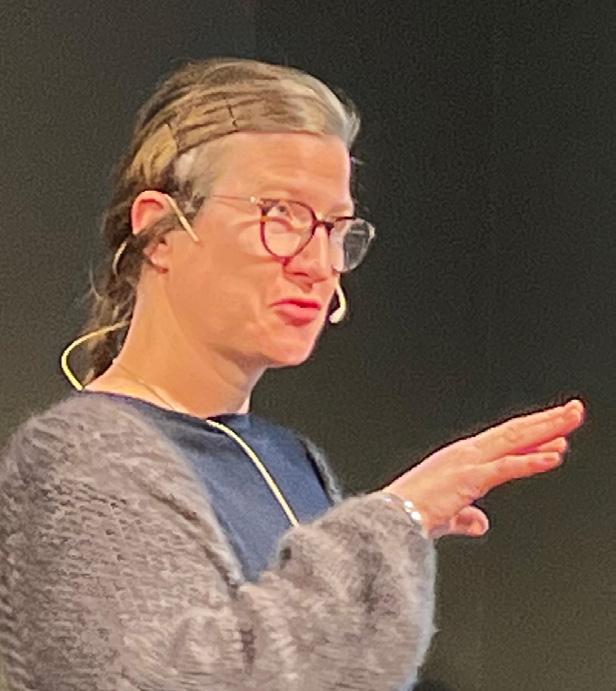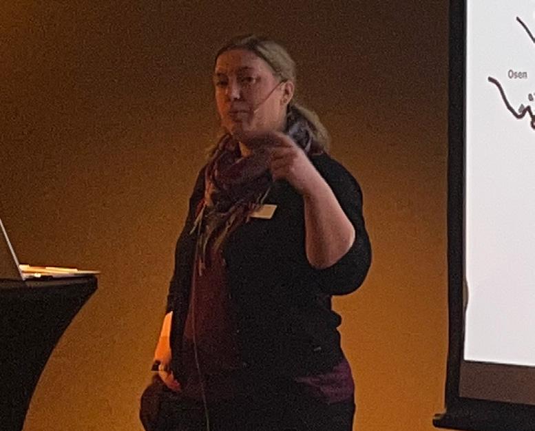 Stemningsbilde fra konferansen. Mathilde Sprovin forteller om Thoralf-huset og brygga på Røst. Fotograf: Ruth Tove Trang-Liljar, Nordland fylkeskommune