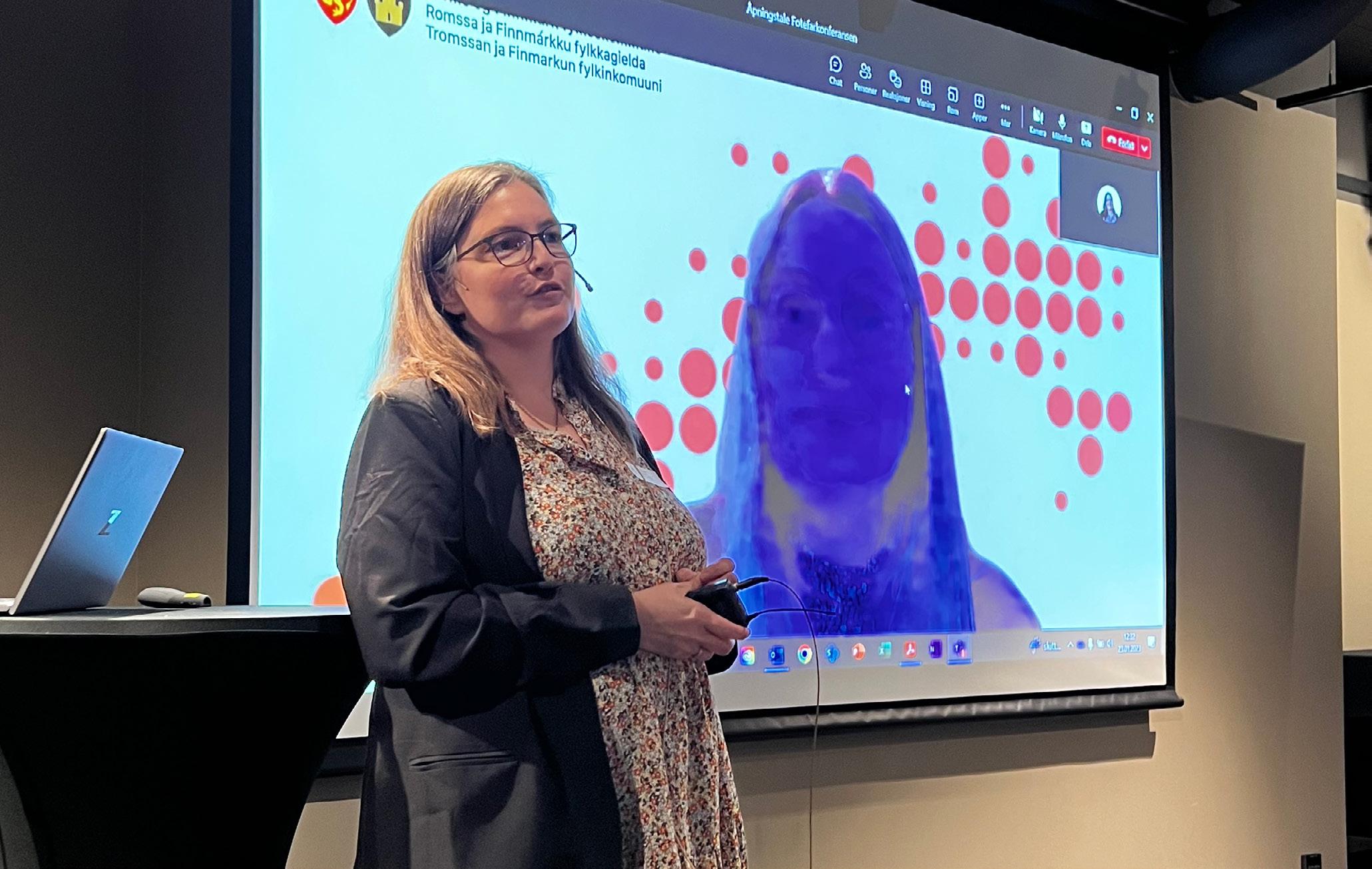 Silje Evjenth Bentsen, prosjektleder for Fotefar mot nord, gir ordet til Karin Eriksen, fylkesråd i Troms og Finnmark fylkeskommune. Karin Eriksen åpnet konferansen med et innlegg via Teams, da nordnorsk vintervær førte til at rutebådene var innstilt og fylkesråden kom seg derfor ikke til Tromsø. Fotograf: Ruth Tove Trang-Liljar, Nordland fylkeskommune.