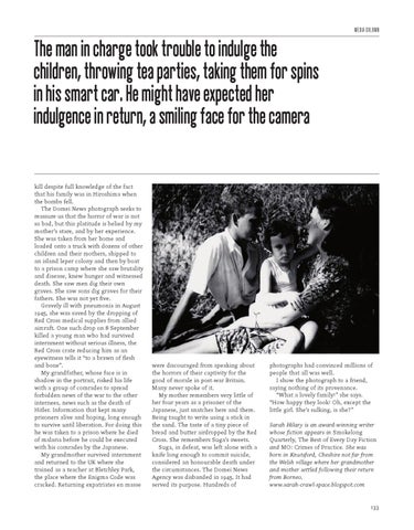 kill despite full knowledge of the fact that his family was in Hiroshima when the bombs fell. The Domei News photograph seeks to reassure us that the horror of war is not so bad, but this platitude is belied by my mother’s stare, and by her experience. She was taken from her home and loaded onto a truck with dozens of other children and their mothers, shipped to an island leper colony and then by boat to a prison camp where she saw brutality and disease, knew hunger and witnessed death. She saw men dig their own graves. She saw sons dig graves for their fathers. She was not yet five. Gravely ill with pneumonia in August 1945, she was saved by the dropping of Red Cross medical supplies from allied aircraft. One such drop on 8 September killed a young man who had survived internment without serious illness, the Red Cross crate reducing him as an eyewitness tells it “to a brawn of flesh and bone”. My grandfather, whose face is in shadow in the portrait, risked his life with a group of comrades to spread forbidden news of the war to the other internees, news such as the death of Hitler. Information that kept many prisoners alive and hoping, long enough to survive until liberation. For doing this he was taken to a prison where he died of malaria before he could be executed with his comrades by the Japanese. My grandmother survived internment and returned to the UK where she trained as a teacher at Bletchley Park, the place where the Enigma Code was cracked. Returning expatriates en masse