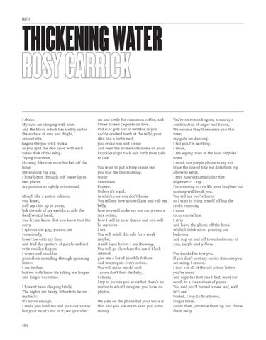 You’re on remand again, accused; a combination of anger and booze, We assume they’ll sentence you this time; my guts are dancing. I tell you I’m working, I smile, - I’m wiping arses in the local old folks’ home. I crook our purple phone to my ear, trace the line of tiny red dots from my elbow to wrist, - they have industrial cling film dispensers!! I say, I’m straining to crackle your laughter but nothing will break you. You tell me you’re horny so I start to bring myself off but the credit runs dry, I come to an empty line. I strip and leave the phone off the hook whilst I think about painting our bedroom and nap on and off towards dreams of you, purple and yellow. I’ve decided to test you. If you don’t spot my tactics it means you are using, I reason. I root out all of the old prison letters you’ve saved and copy the first one I find, word for word, to a clean sheet of paper. You said you’d turned a new leaf, well let’s see. Posted, I buy 20 Marlboros, Finger them, count them, crumble them up and throw them away.