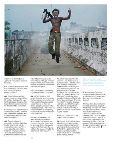 many different images, so the competition is still huge. There are people evolving from the industry all of the time and we think healthy competition is good. 8: Is Getty Images monopolising the stock photography market? AM: We’re a big player but I wouldn’t use the word monopoly. We have a large market share but there are a lot of specialist areas we don’t cover, so there are always going to be spaces in the market elsewhere. I don’t think we have created this all-conquering monopoly that some others seem to think we have. 8: A number of independent agencies have been told by picture desks that however low they go on the price they charge for an image, they will always be beaten by Getty Images. Do you not think this poses a threat to the creative side of the industry?
