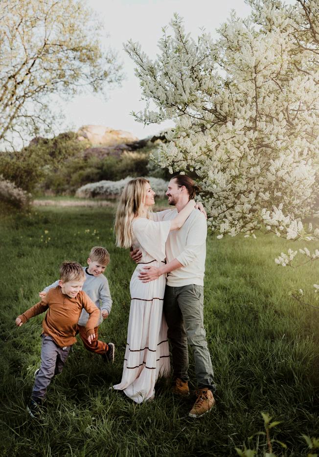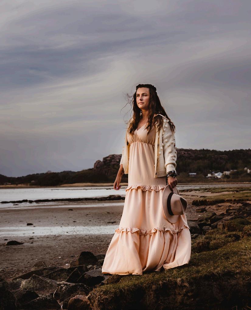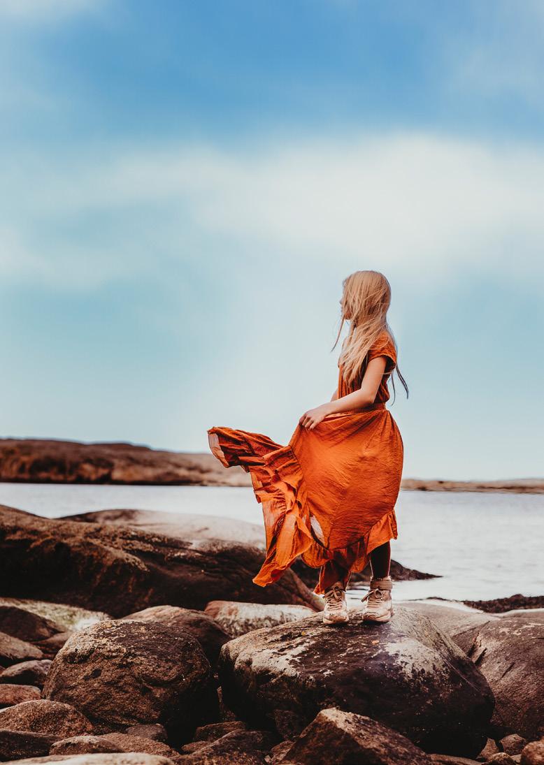 Tänk lager på lager och olika material som ljuset kan få leka i. Jag älskar att fånga rörelse under en fotogra fering. Tex mammors långklänningar med mycket tyg i som svajar i solnedgången eller tunna tyger som fladdrar under lek med barnen. Det ger en helt annan dimension av liv och rörelse till bilden. Lägg till en stickad kofta, jacka eller en öppen skjorta utanpå plagget du bär upptill. Sådana plagg är lätt att byta och du får större variation på bilder. Andra saker som man kan addera är tex en scarf, halsduk, skärp, hatt eller blazer.