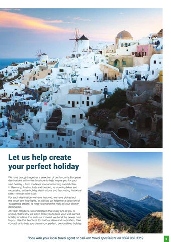 Let us help create your perfect holiday We have brought together a selection of our favourite European destinations within this brochure to help inspire you for your next holiday – from medieval towns to buzzing capital cities in Germany, Austria, Italy and beyond; to stunning lakes and mountains, active holiday destinations and fascinating historical sites – we can offer it all! For each destination we have featured, we have picked out the ‘must see’ highlights, as well as put together a selection of ‘suggested breaks’ to help you make the most of your chosen destination. At Fred.\ Holidays, we understand that every one of you is unique, that’s why we won’t force you to take your well-earned holiday at a time that suits us, instead, we hand the power over to you. Use this brochure for holiday ideas and inspiration, then contact us to help you create your perfect, personalised holiday.