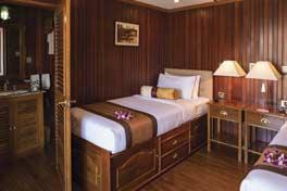 Finished in brass and teak, the main and upper deck rooms are a spacious 168 square feet (15.6 sqm), with the exception of the Zawgyi Pandaw which is 150 square feet (14 sqm). As the space is much loved by all our passengers, we have ensured that with each ship we build, the stateroom remains essentially the same. Be advised: our cabins do not have mini-bars, satellite TV's, internet access or telephones. Passengers tend to choose Pandaw in order to escape from the tiresome features found in international business hotels.