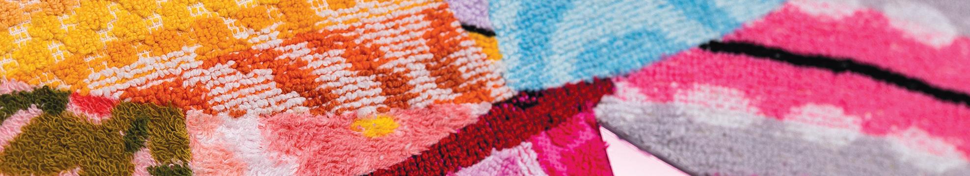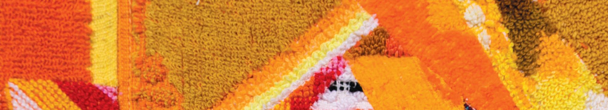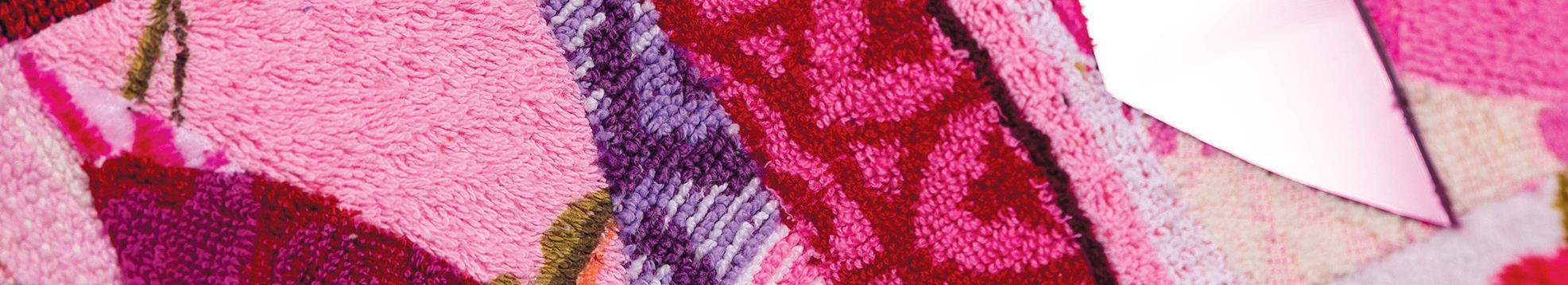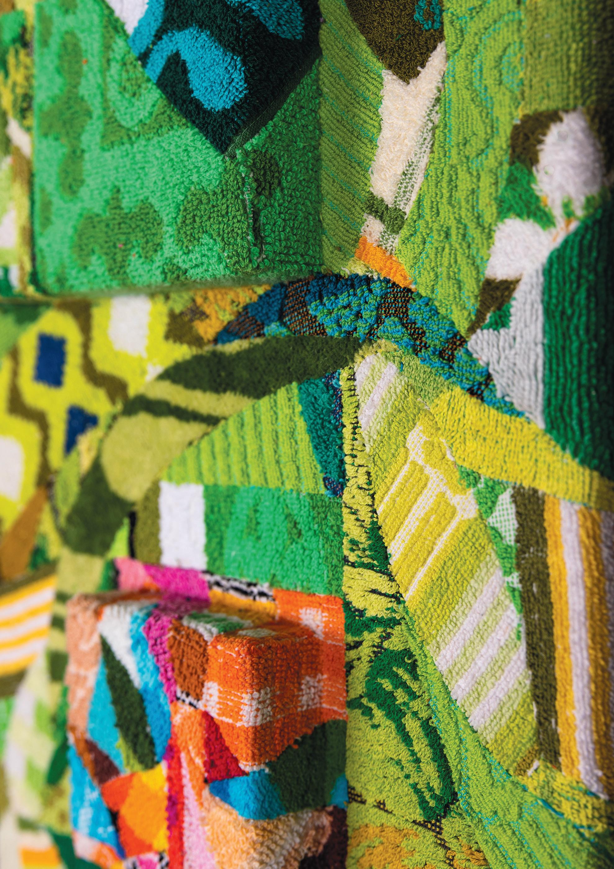 un/conscious is a large-scale artwork that features a mosaic of sixteen brightly coloured Fluffied canvases. The textiles featured are ‘waste’ offcuts that have been donated to Jamie-Lee by Re/lax Remade, a sustainably focused, Sydney-based fashion label that creates wearables out of vintage towels. Each piece of fabric is embedded with the memories of the previous owner, an ode to the generations of families that lived with these towels.