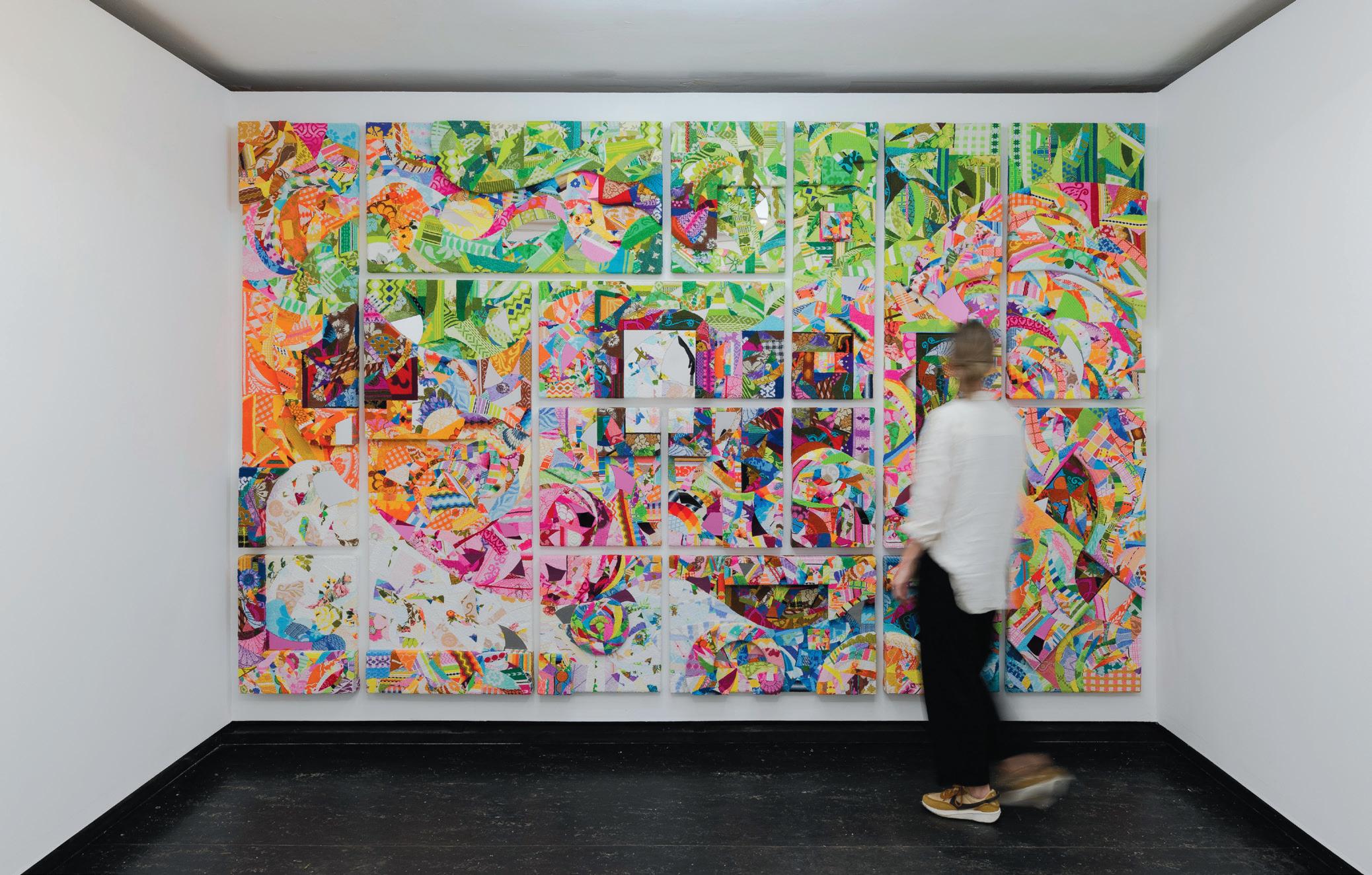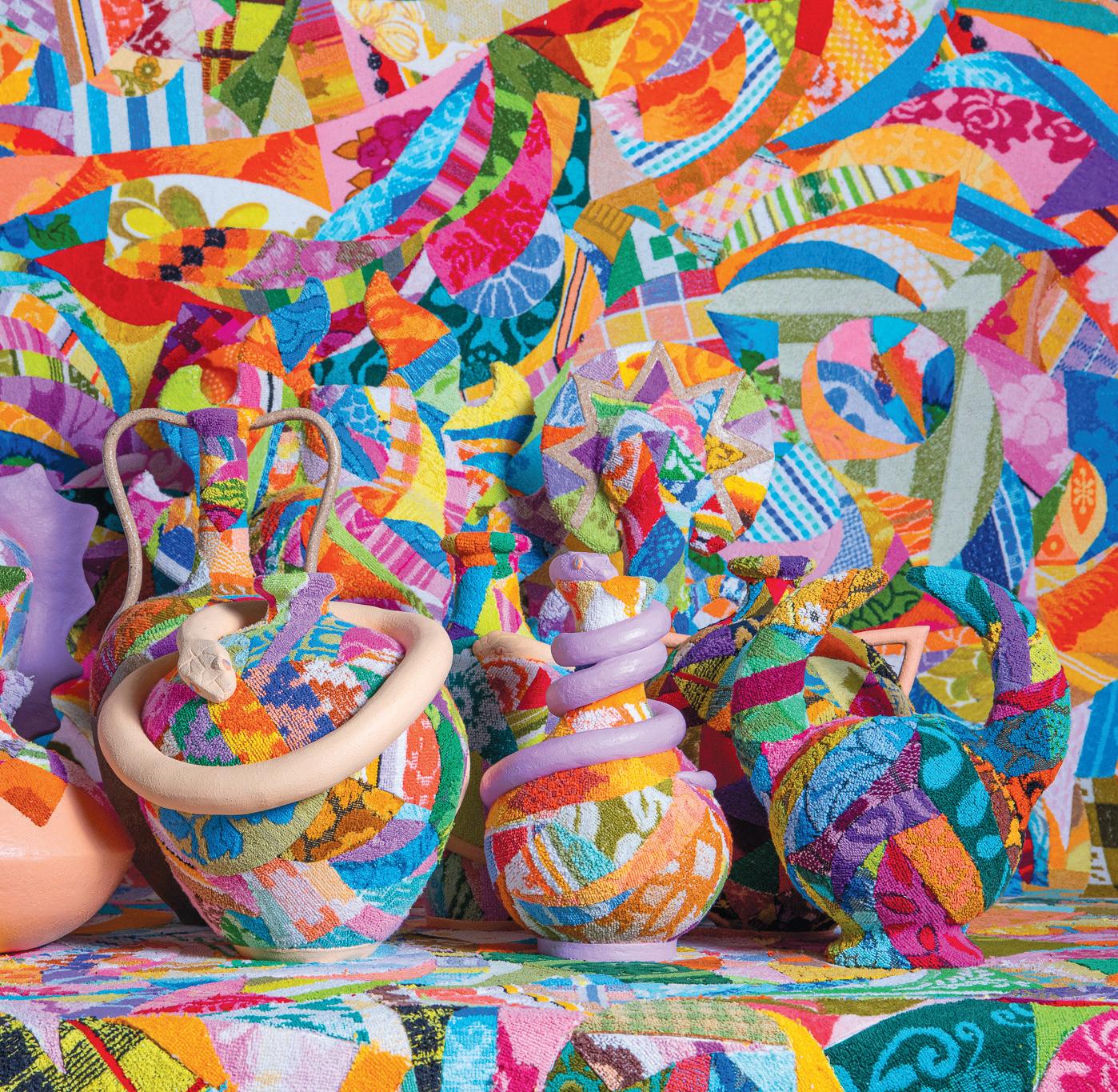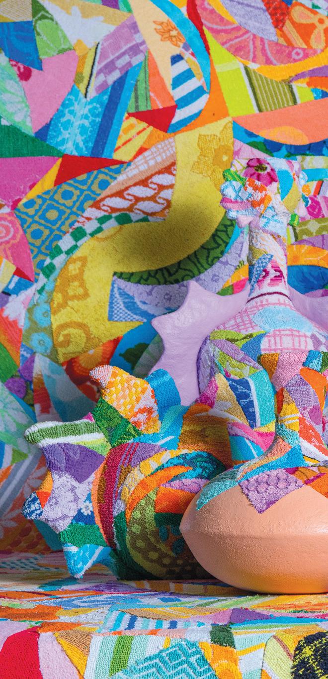 un/conscious is a large-scale artwork that features a mosaic of sixteen brightly coloured Fluffied canvases. The textiles featured are ‘waste’ offcuts that have been donated to Jamie-Lee by Re/lax Remade, a sustainably focused, Sydney-based fashion label that creates wearables out of vintage towels. Each piece of fabric is embedded with the memories of the previous owner, an ode to the generations of families that lived with these towels.