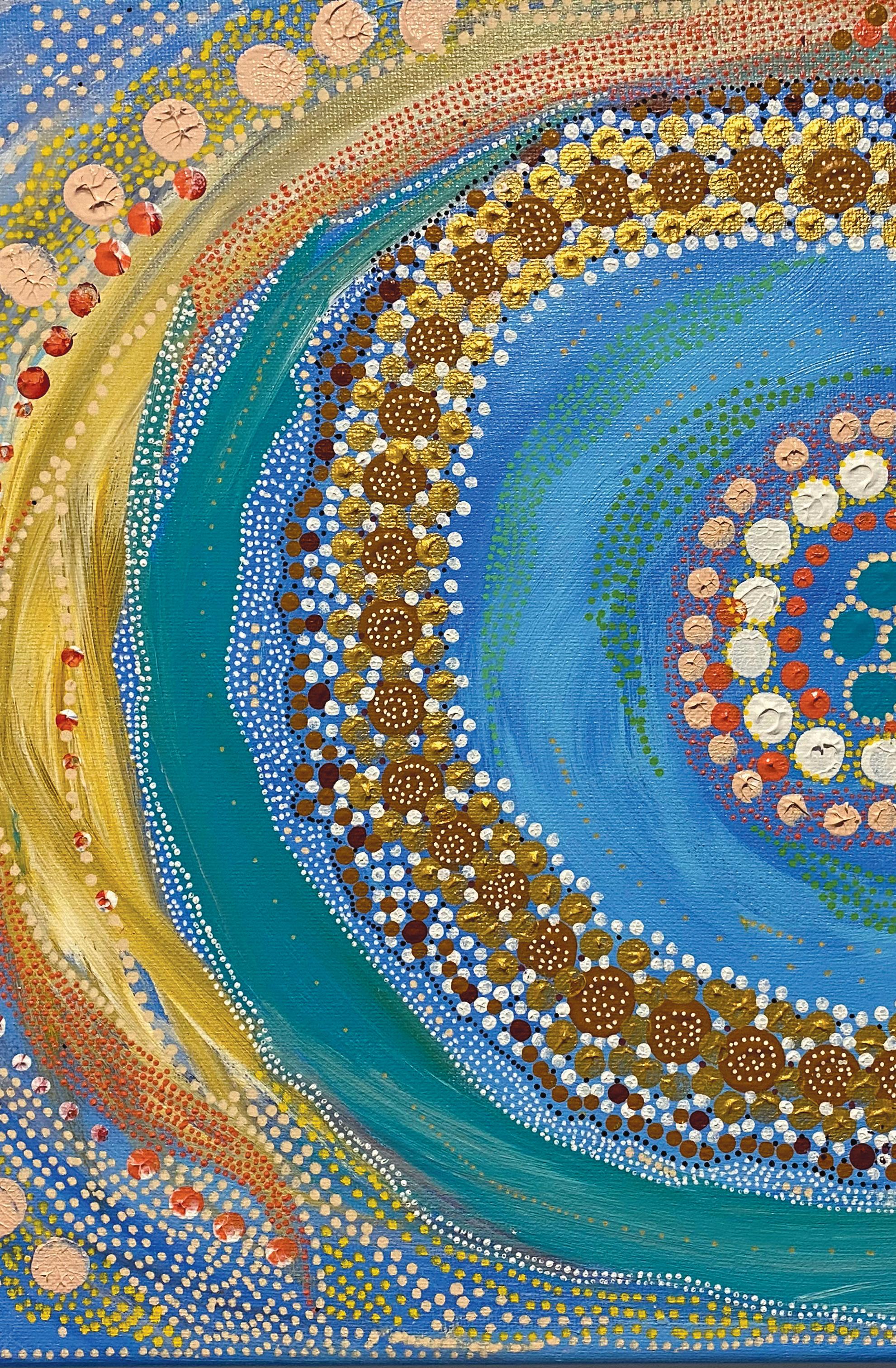 With thanks to Josie Rose, a proud Gumbaynggirr artist, for sharing this stunning artwork, Figure 8 Pool. Josie creates a rich tapestry of Indigenous knowledge and connection to Country featuring vibrant colours with intricate and abstract designs inspired by contemporary expression of wajaarr (Country) and guunuwaygam (life). She regularly facilitates creative workshops at Yarrawarra Aboriginal Cultural Centre and recently successfully showcased her inaugural solo exhibition, ‘Bower Bird’, at the Wadjar Regional Indigenous Gallery.