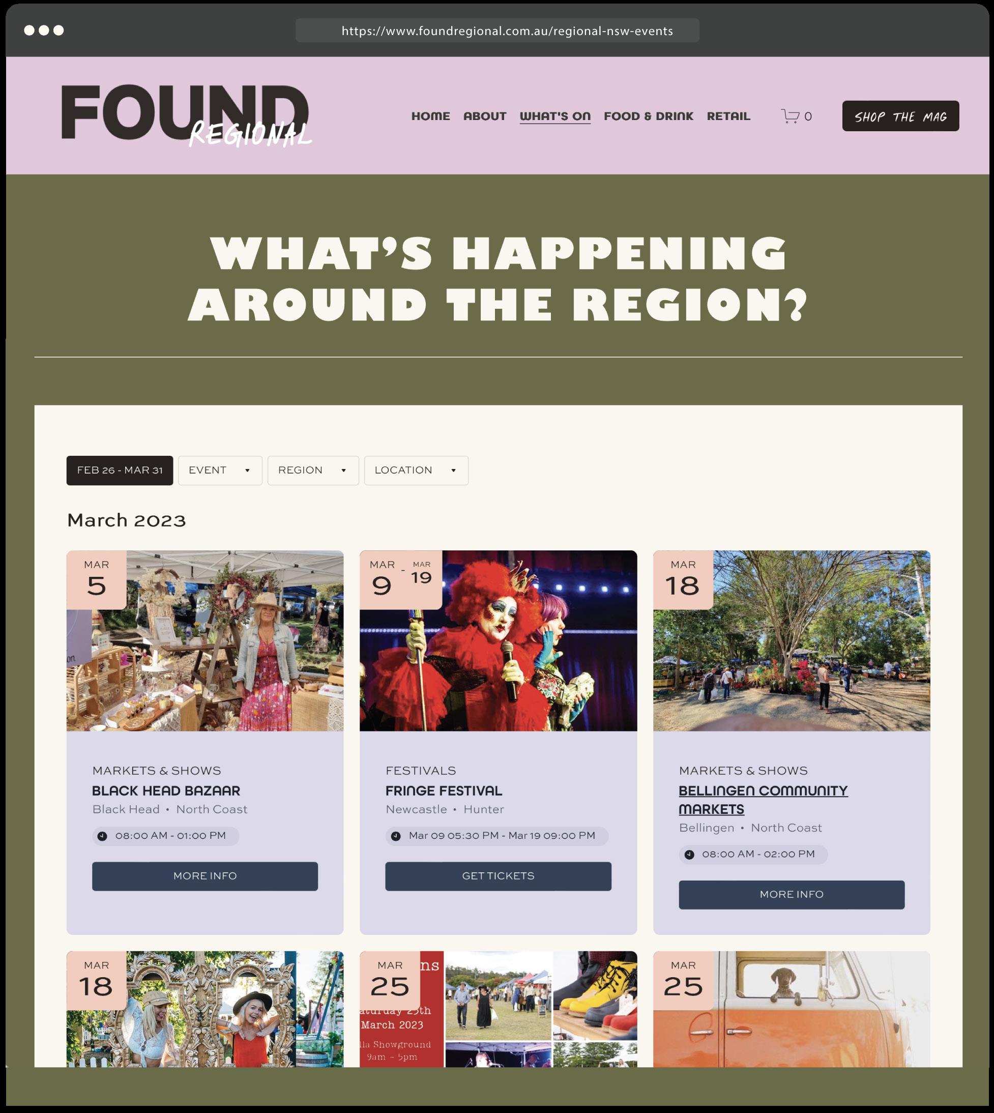 If you want to know what's happening from the mountains to the sea, hit up our brand spanking new events calendar. From markets to music, art exhibitions to comedy, you'll never be short of regional adventures ever again. Please email to: events@foundregional.com.au
