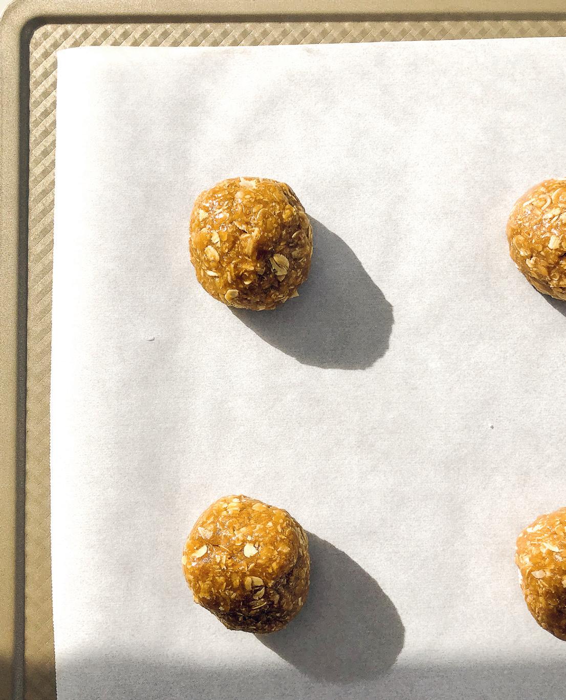 Pour into dry ingredients and stir until combined. Roll into balls – the size is up to you, a 40g to 50g ball is my ideal. Place on a baking tray lined with baking paper and flatten slightly.