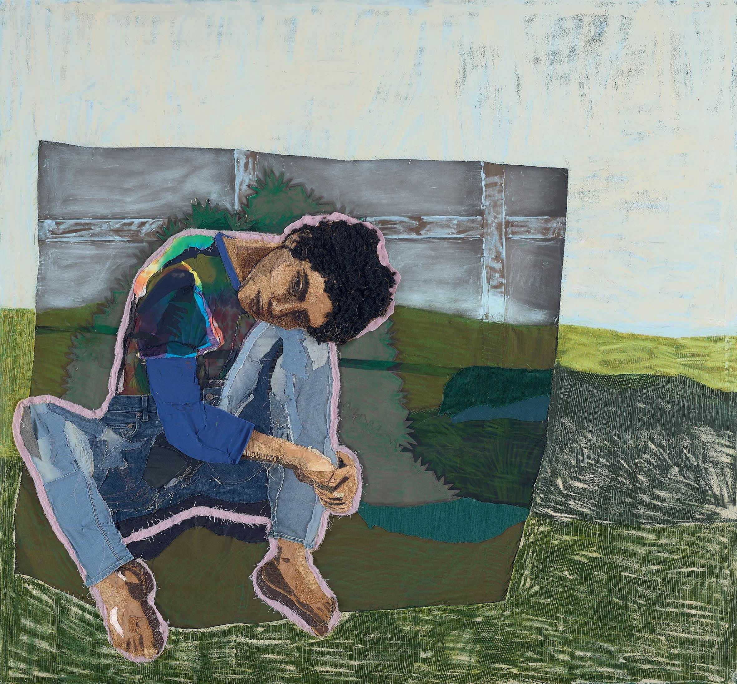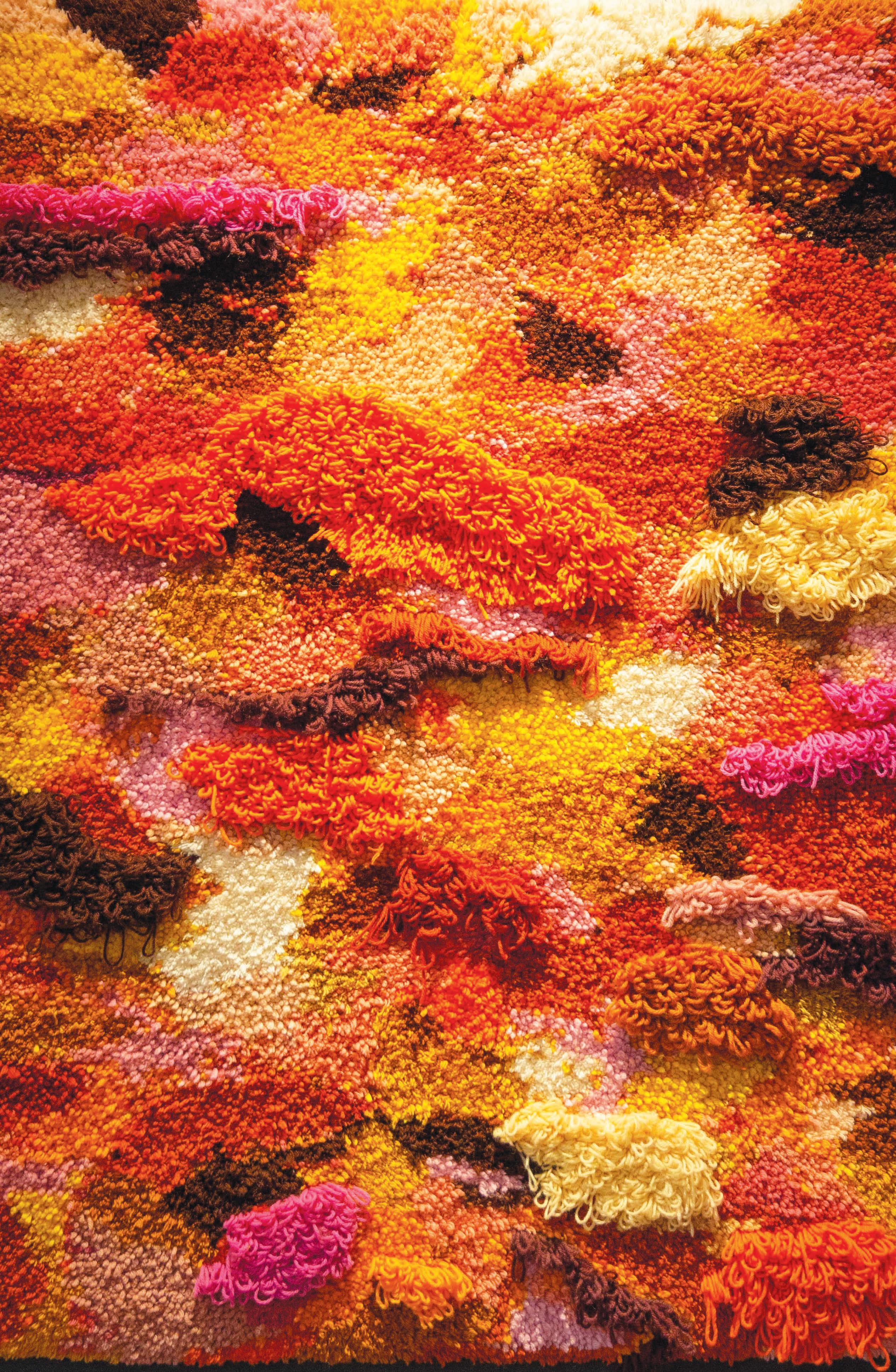 “I love rummaging in op shops for supplies: fabric remnants, half-completed cross-stitches, leftover yarn, tubs of crochet hooks and odd buttons.They tell the story of their previous owner, producing images of rest – of women in armchairs, stitching. The items themselves also speak of rest. They have been resting in boxes, cupboards and drawers, sometimes for decades. This work embodies my rest. I made no drafts or plans. I simply sat on the mat, surrounded by the wool and started weaving. I felt my spirit revived through this rest. I was able to create intuitively, grouping my favourite colours together and creating texturing and composition.”