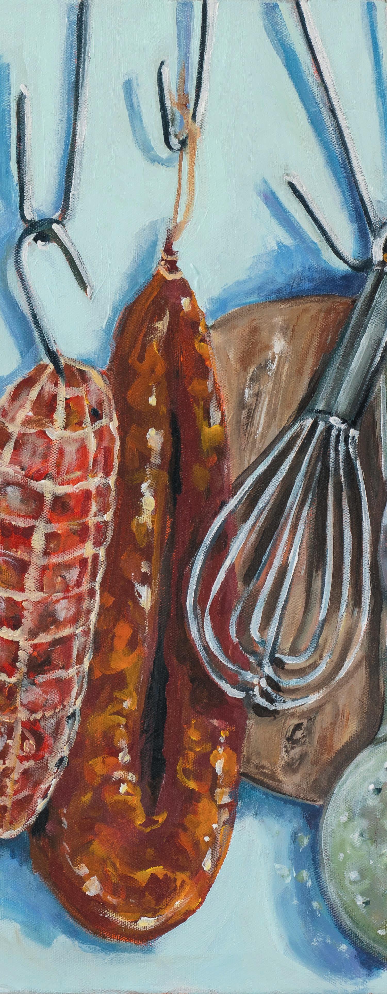 Kim Bizo likes to think of her work as a playful and joyous exploration of the culinary theme that has become a predominant staple for contemporary still life over the past couple of years. She’s drawn to food as her subject because she finds so much pleasure cooking for her family and friends; sharing a meal is always a celebration, and her paintings are a reflection of this. She’s certainly not afraid of quirky subjects, for example, a pickle, cheese board, sausage or a simple dippy egg. Always, however, attempting to capture the essence of that foodie delight. Kim works from her sunny, country kitchen in Armidale surrounded by many of her favourite props, with coffee never far away.