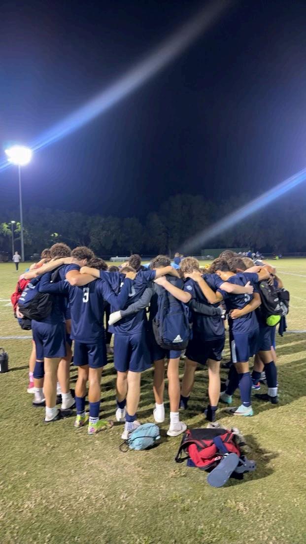 Above, the Foundation Academy Boys Varsity Soccer Team pray together to close out the night, capping off a 3-0 victory and player baptism ceremony