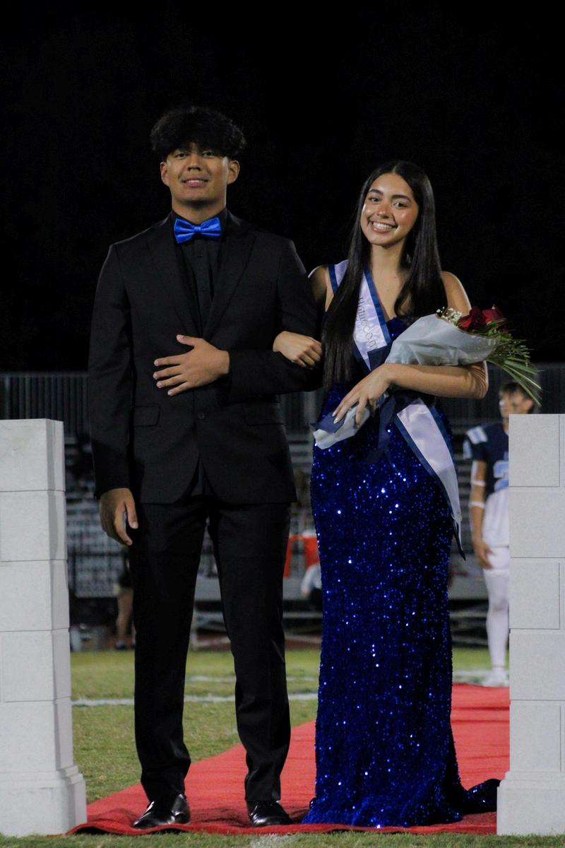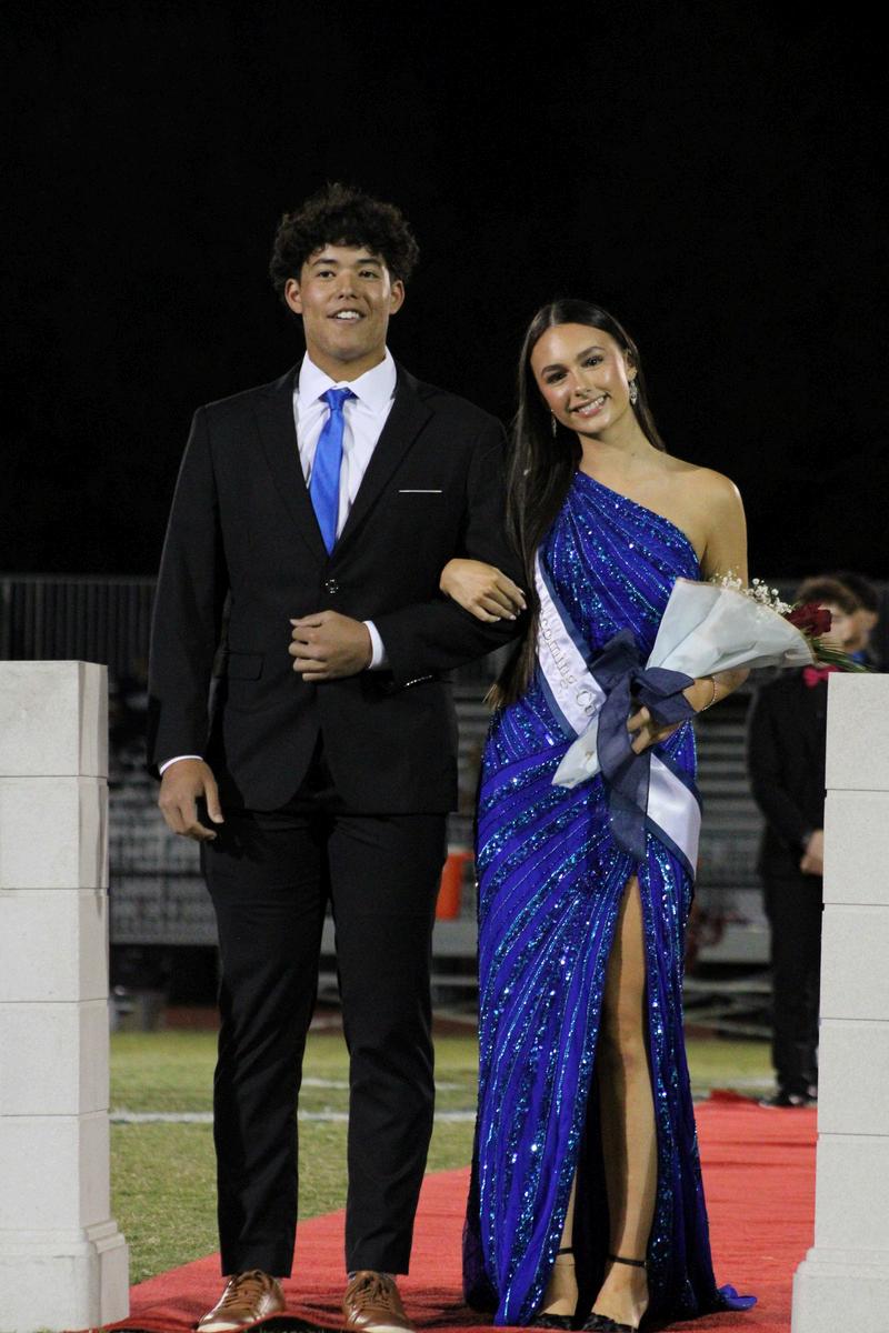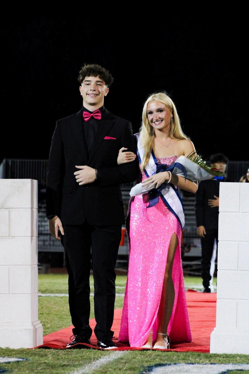 Consisting of a boy and girl from each grade, voted by the students, every pair represented their class with pride. The freshman pair were Milly McMullan and Ashton Minner, and the sophomores were Makayla DeSalvia and Lucas Kelly. The junior duo was Kayla Bolivar and Carson Andrews, and the seniors were represented by four different couples. The students selected were Angel Noak and Geiliany Delvaliey, Ray Martinez and Raegan Weiss, Gavin Badua and Ella Sharp, and Ana Izquierdo Varela and Jacob McFarland. As they walked down the football field, it was a close competition to see who would be crowned Homecoming king and queen.