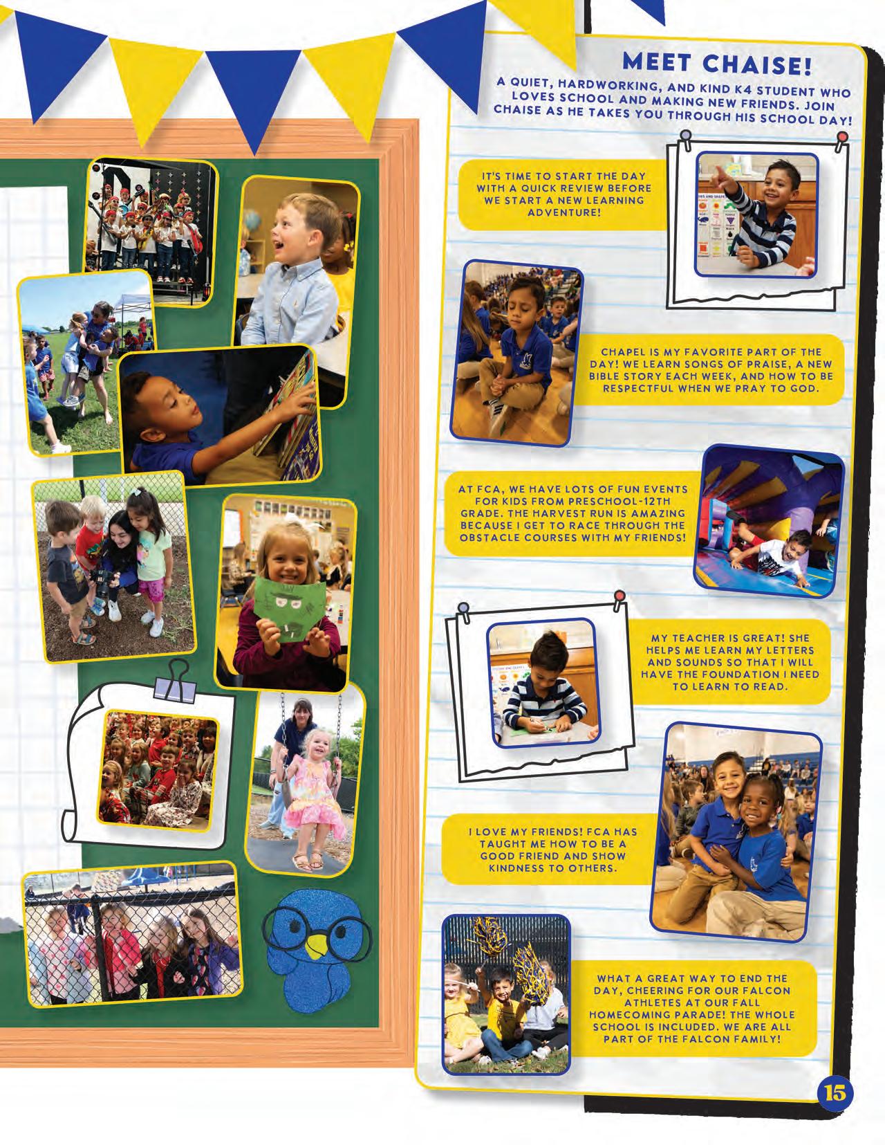 Welcome to the 2024 edition of the Ascend magazine! Foundation Christian Academy has had an incredible year! Along with record attendance and construction, we have had an outstanding year of academic success and spiritual growth. In this issue, we share a glimpse into the life of a preschool student, an elementary student, and an upper school student to demonstrate the amazing things that happen daily on our campus. As you turn each page of this magazine, I know that you will see the many ways that God is blessing our students, our staff, and our supporters. Thank you so much for helping FCA provide our students with a .