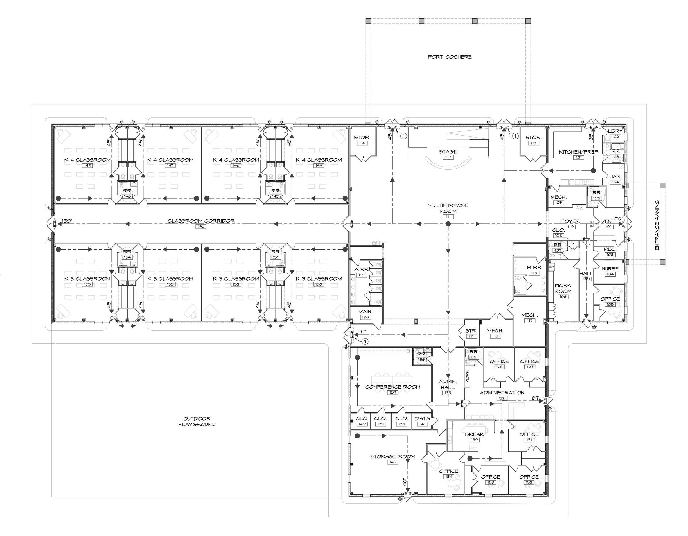 After our board and administration worked on the master plan, some adjustments were made to the Falcon’s Nest layout. Previously, the side wing was going to be used temporarily by the Upper School. However, since the master plan is to build the Activity Center next, and more of the middle school will be in the building constructed last year, the decision was made to have a more permanent use of the side wing of the Falcon’s Nest. As the layout shows, this side wing will become an administrative wing. This wing will have offices for the Director of Admissions, Financial Manager, President, Executive Assistant, and Development Director. The wing will also house a board conference room that will also be used for teacher training and other functions. A storage room for the preschool and administration will be in that area as well.