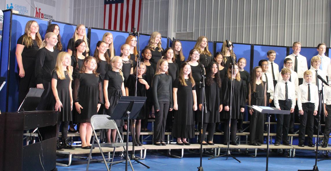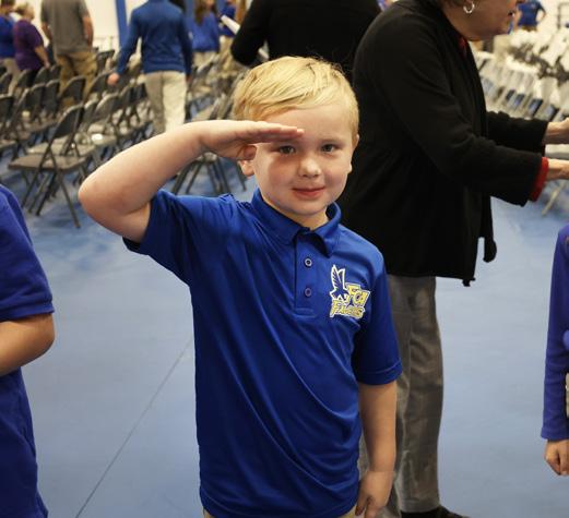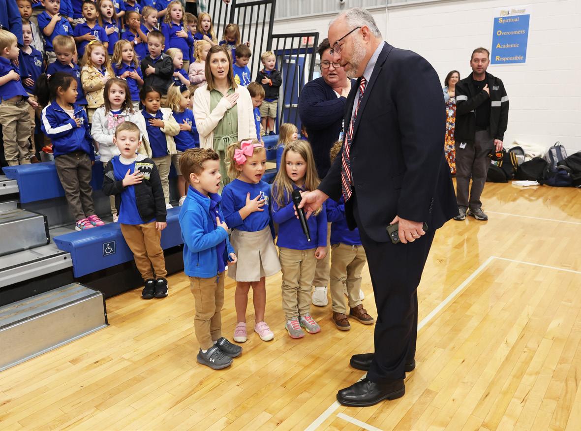 Preschool students lead the audience in the Pledge of Allegiance at the Veterans Day Program.