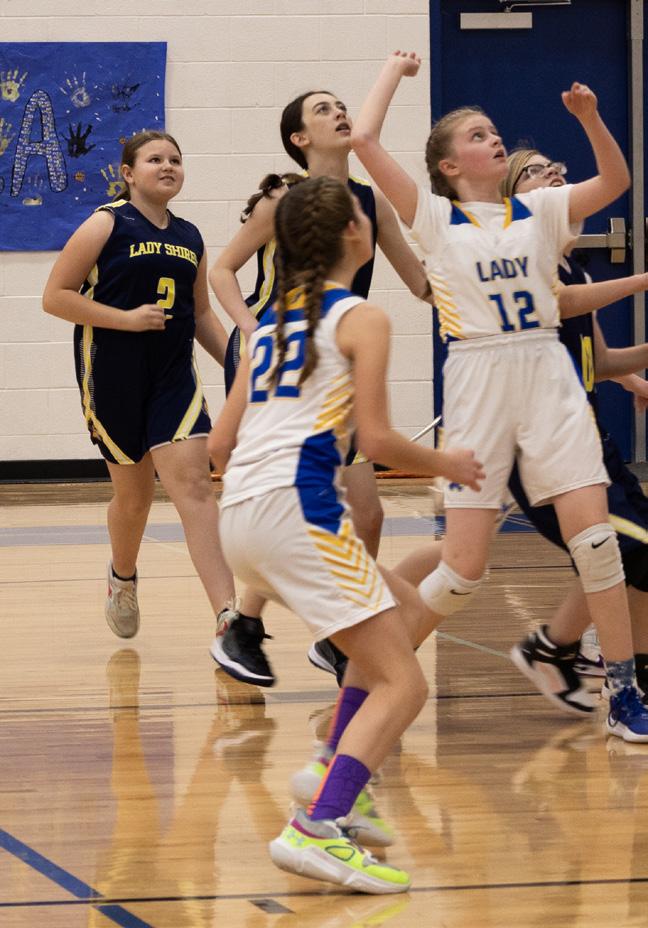 H. Lillian Barr and Caroline Thomas play in the middle school girls basketball homecoming game.