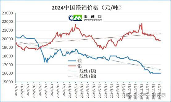 In 2024, China's magnesium ingot prices continued to decline, falling from 20,200 yuan/ton at the beginning of the year to 16,000 yuan/ton by year-end, with 16,000 yuan becoming a critical support level. By the end of 2024, magnesium prices had retreated to levels last seen in April 2021, marking the lowest point in 44 months. The monthly average price of magnesium dropped from 20,183 yuan/ton in January to 16,024 yuan/ton in December. The full-year average price for 2024 was 17,994 yuan/ ton, down 18% year-on-year compared to 2023 – the lowest in four years. Over the year, prices fell by 4,200 yuan, a decline of 20.8%.
